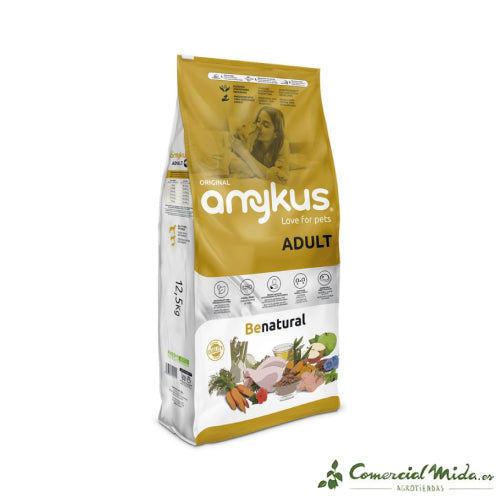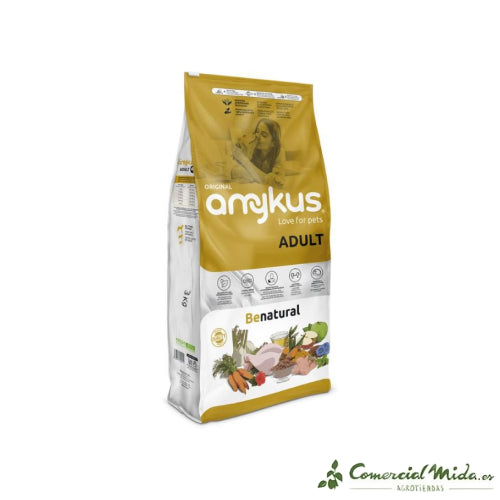 El pienso Amykus Original Adult es un alimento completo, saludable y equilibrado, diseñado para que los perros adultos satisfagan sus necesidades nutricionales con un nivel de actividad normal, independientemente de su raza o tamaño. Esta fórmula está especialmente adaptada a su edad, cubriendo sus necesidades nutricionales específicas. Promueve una mejora en la condición física, ya que la combinación de sustancias vitales potencia su bienestar general. Desarrollada por nutricionistas y veterinarios, esta receta asegura una nutrición óptima.