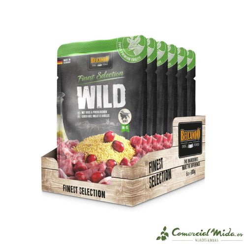Belcando WILD Venado con Arándanos y Mijo es un alimento completo diseñado para satisfacer las necesidades nutricionales de los perros. Este producto se destaca por sus recetas excelentes, presentadas en prácticas raciones individuales. La jugosa carne se mejora con ingredientes delicados y se cocina con esmero en bolsas individuales, garantizando un sabor excepcional y una digestibilidad superior. Ideal para perros sensibles o exigentes, esta comida se elabora con productos naturales y no contiene aromas artificiales, colorantes ni conservantes.