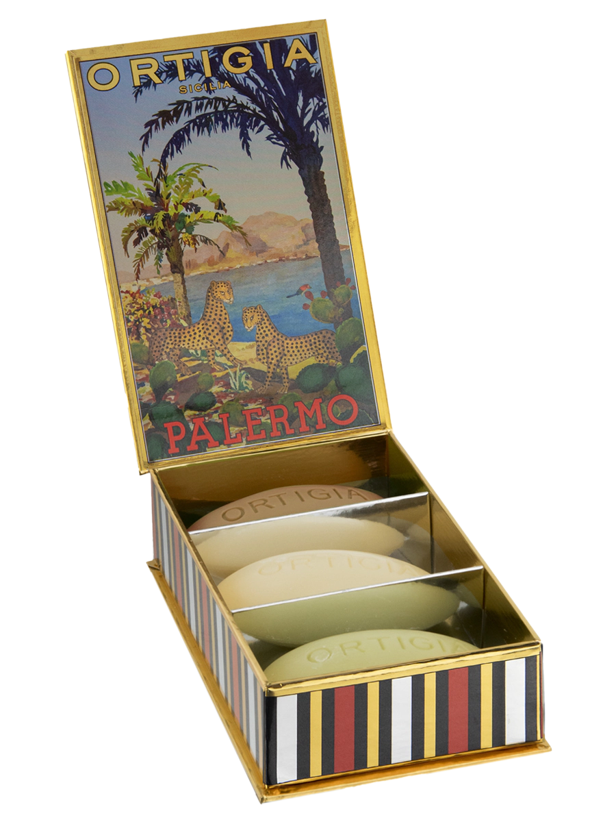 Ortigia Palermo Soap Box è un oggetto neutro. Una graziosa scatola decorata con i motivi della collezione Palermo di Ortigia presenta tre saponette da 40 g ciascuna nelle fragranze Bergamotto, Florio e Fico d’India.