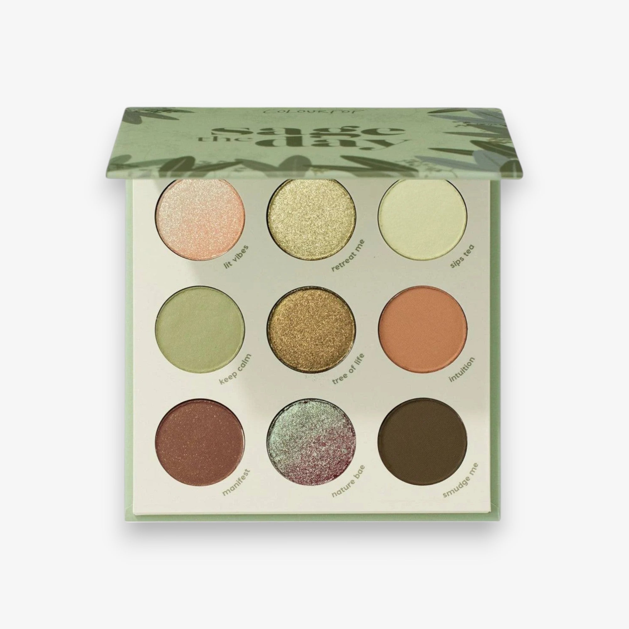 The Sage the Day Palette by ColourPop features a stunning array of green and earth-toned shades, perfect for creating nature-inspired looks with a mix of matte and metallic finishes.