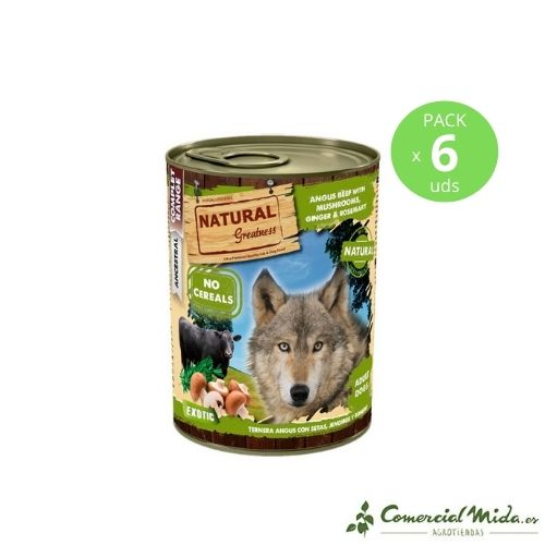 6 lattine da 400 gr di Natural Greatness Complet Beef Angus. EAN 8425402277850.