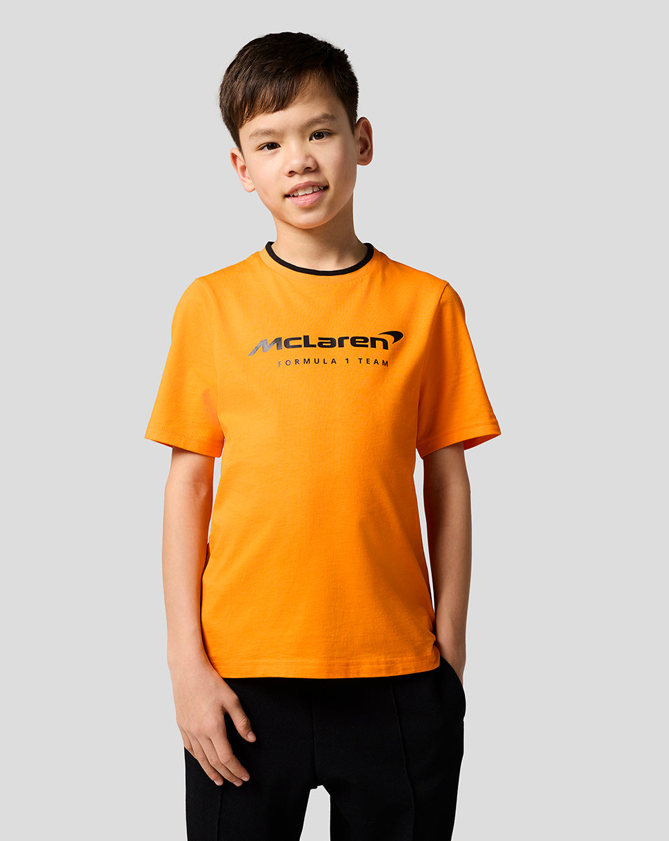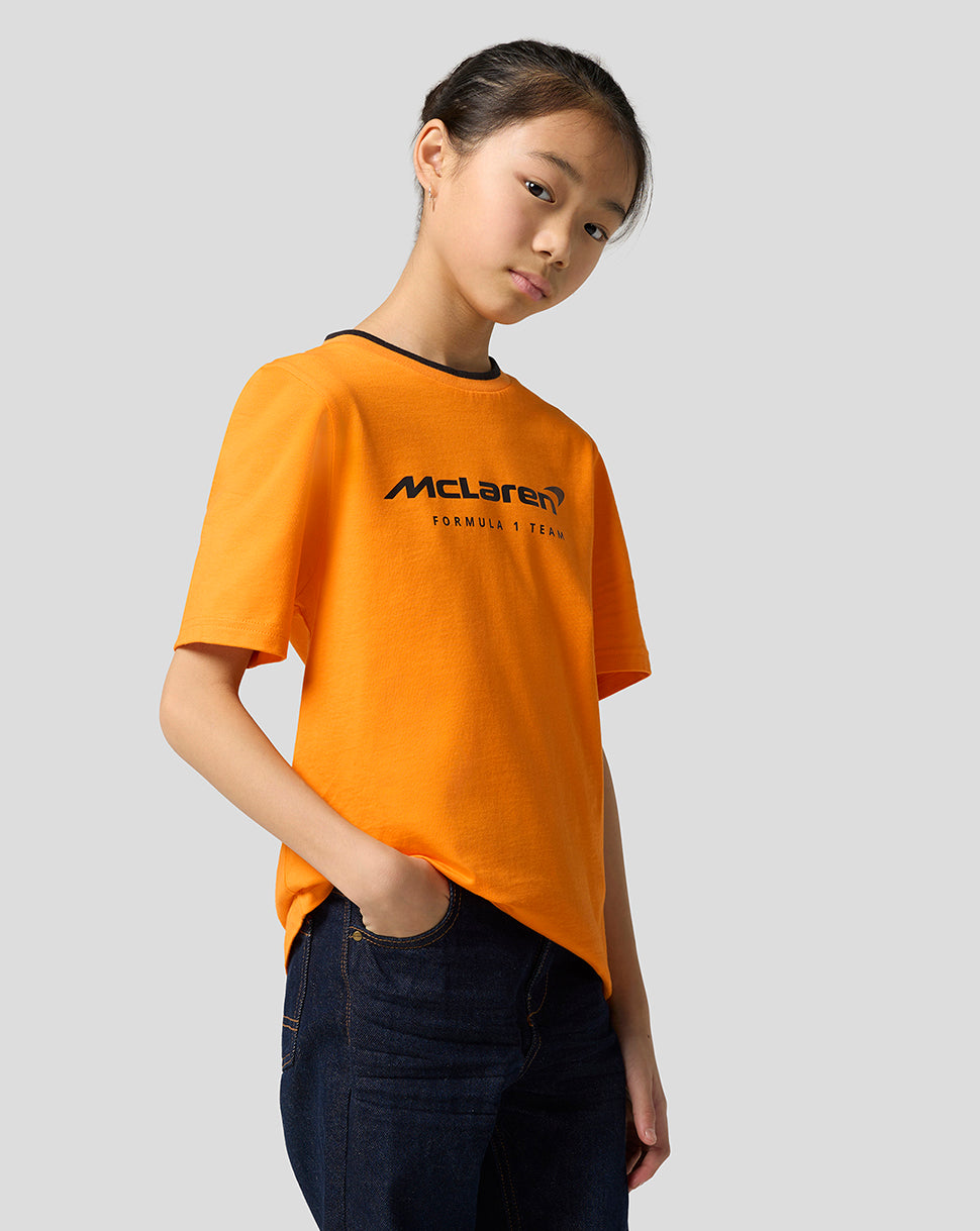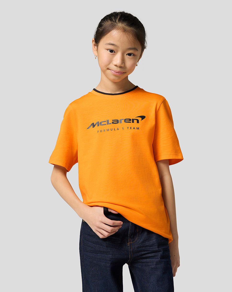 Elevate your little one’s race day attire with the McLaren Racing Unisex Core Essentials T-Shirt. This laid-back jersey features a ribbed crew neckline with subtle team tipping and a large screen-printed type logo at the front. Set-in short sleeves and a classic fit allows unrestricted movement as you gear up for yet another Grand Prix.