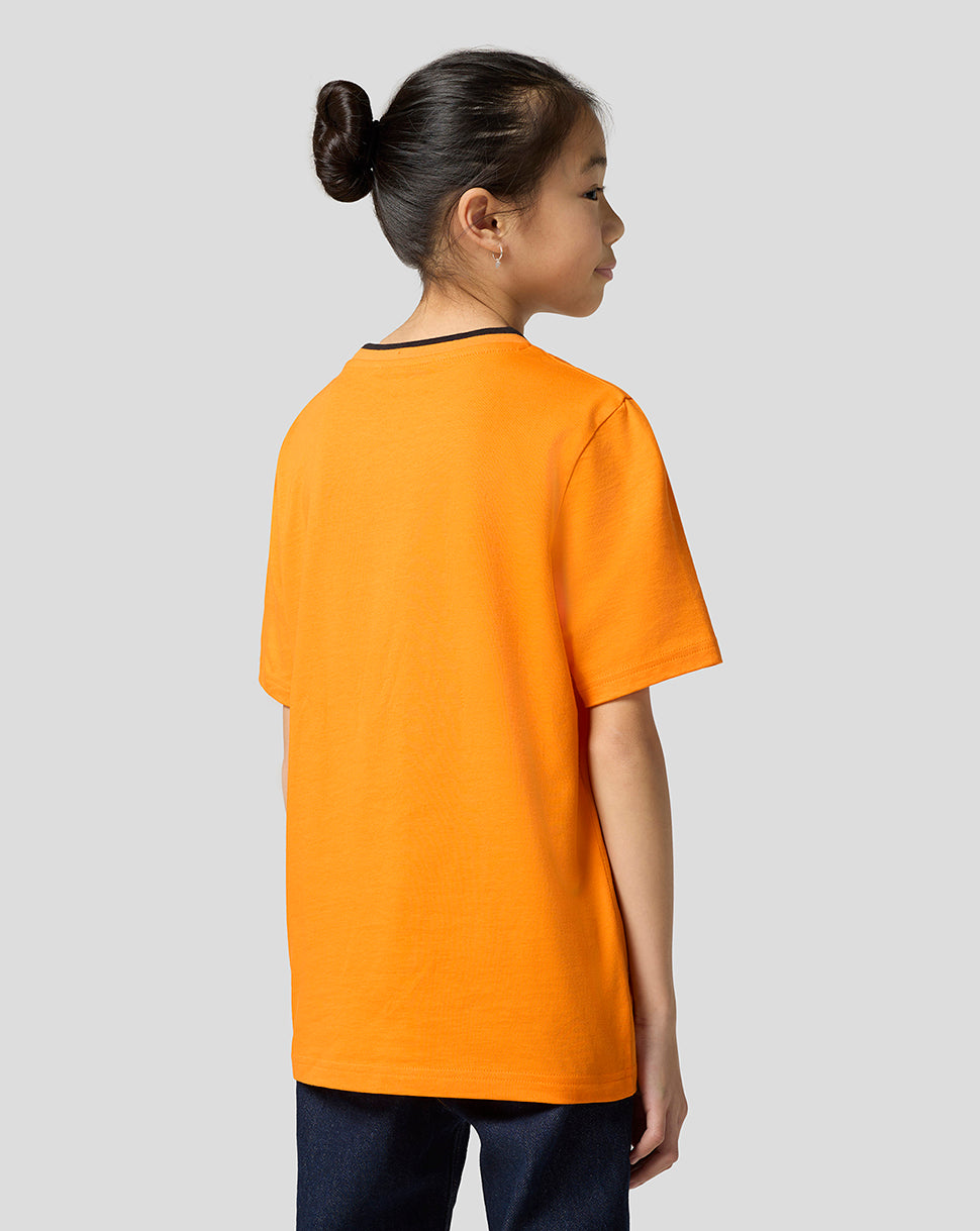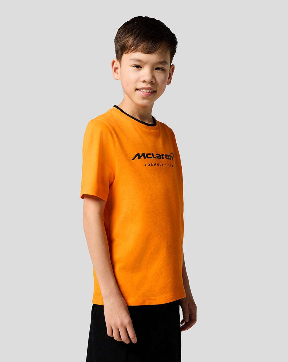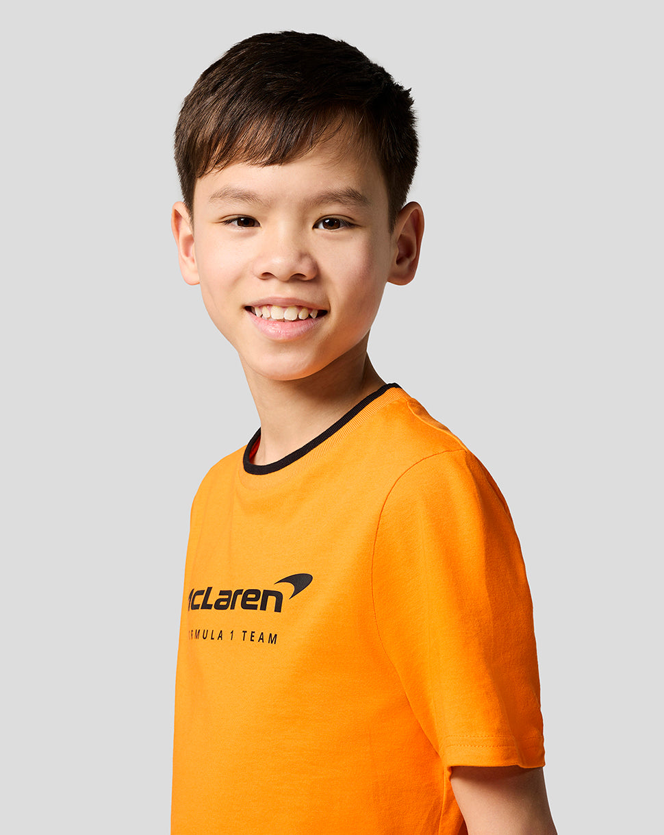 Elevate your little one’s race day attire with the McLaren Racing Unisex Core Essentials T-Shirt. This laid-back jersey features a ribbed crew neckline with subtle team tipping and a large screen-printed type logo at the front. Set-in short sleeves and a classic fit allows unrestricted movement as you gear up for yet another Grand Prix.