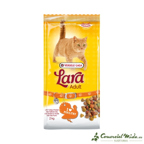 Lara Adult ha un alto contenuto di carne di pollo e tacchino che garantiscono un apporto di minerali e vitamine che permettono al nostro gatto adulto di mantenere uno stile di vita attivo.