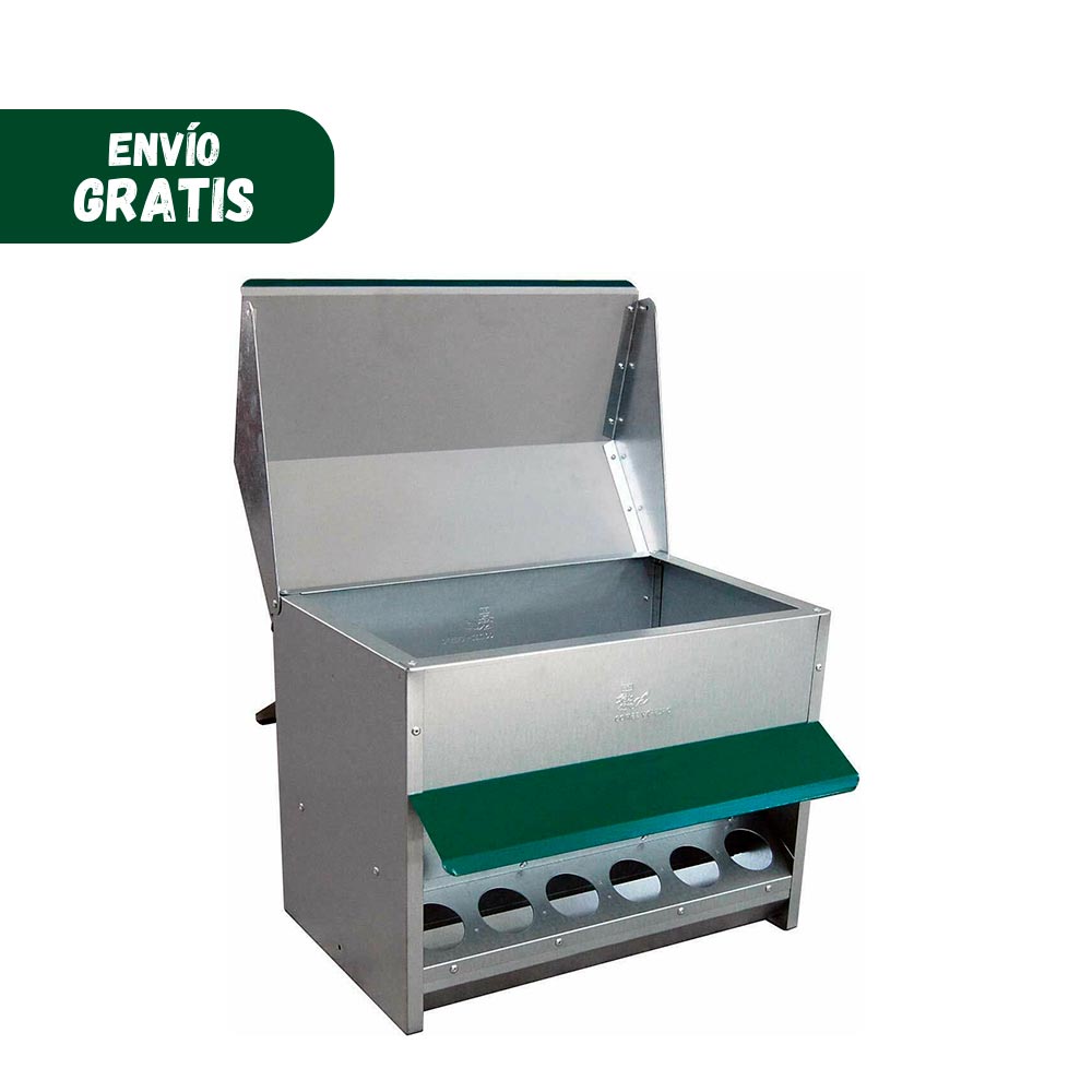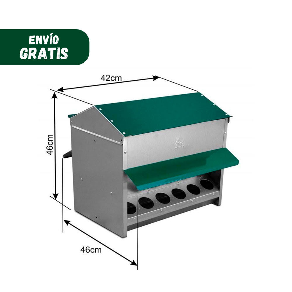 La mangiatoia per uccelli e uccelli NATURA è realizzata in lamiera zincata con coperchio incernierato in lamiera laccata verde per conservare mangime e mangime per uccelli e volatili in giardini, incubatoi o altri luoghi con presenza di qualsiasi volatile domestico. Dispone di 12 buche , 6 per lato, per evitare che il cibo vada sprecato e cada a terra. Ha la capacità di immagazzinare fino a 18 kg di mangime . Misure:lunghezza 42 cm, larghezza 46 cm, altezza 46 cm.