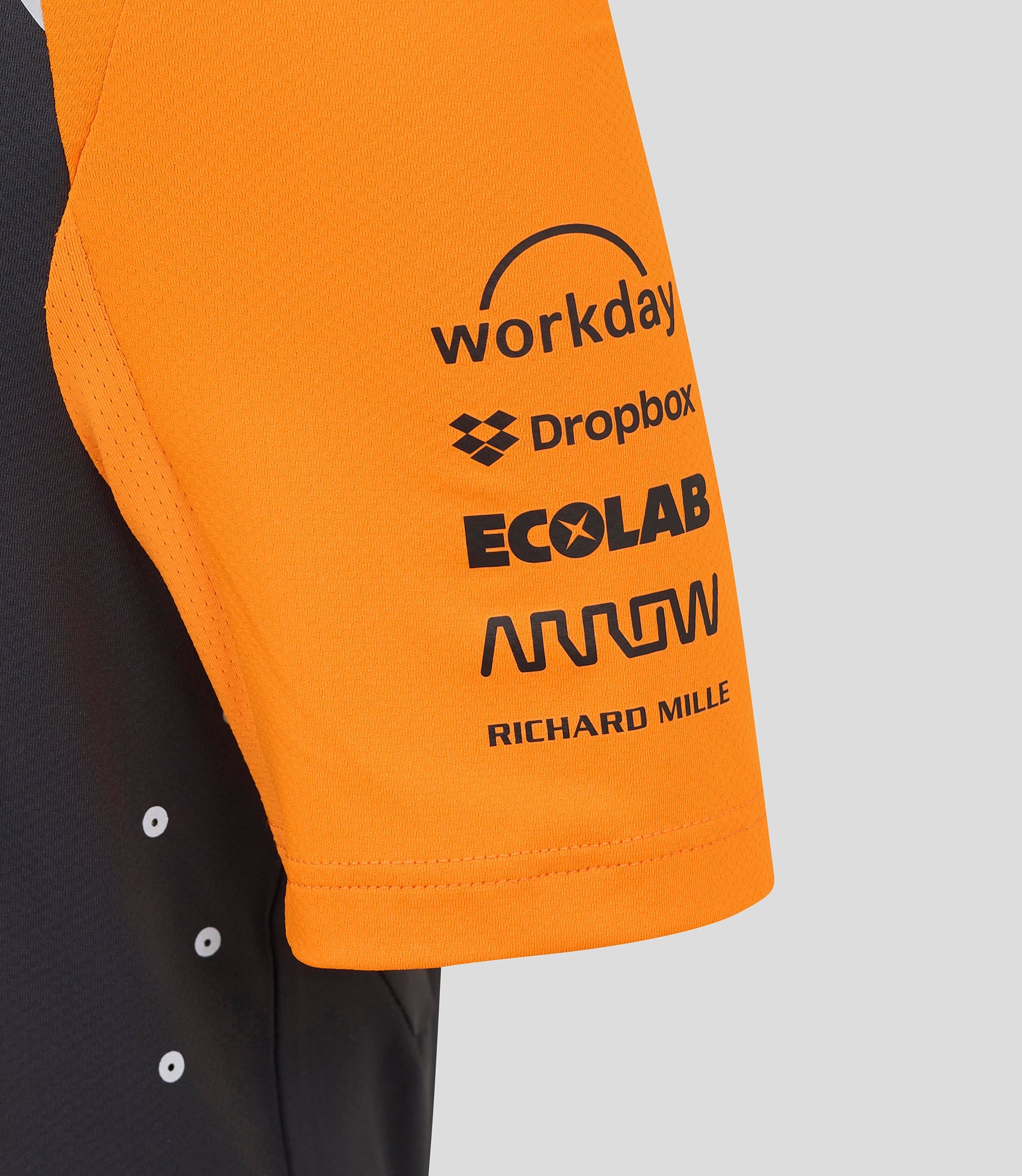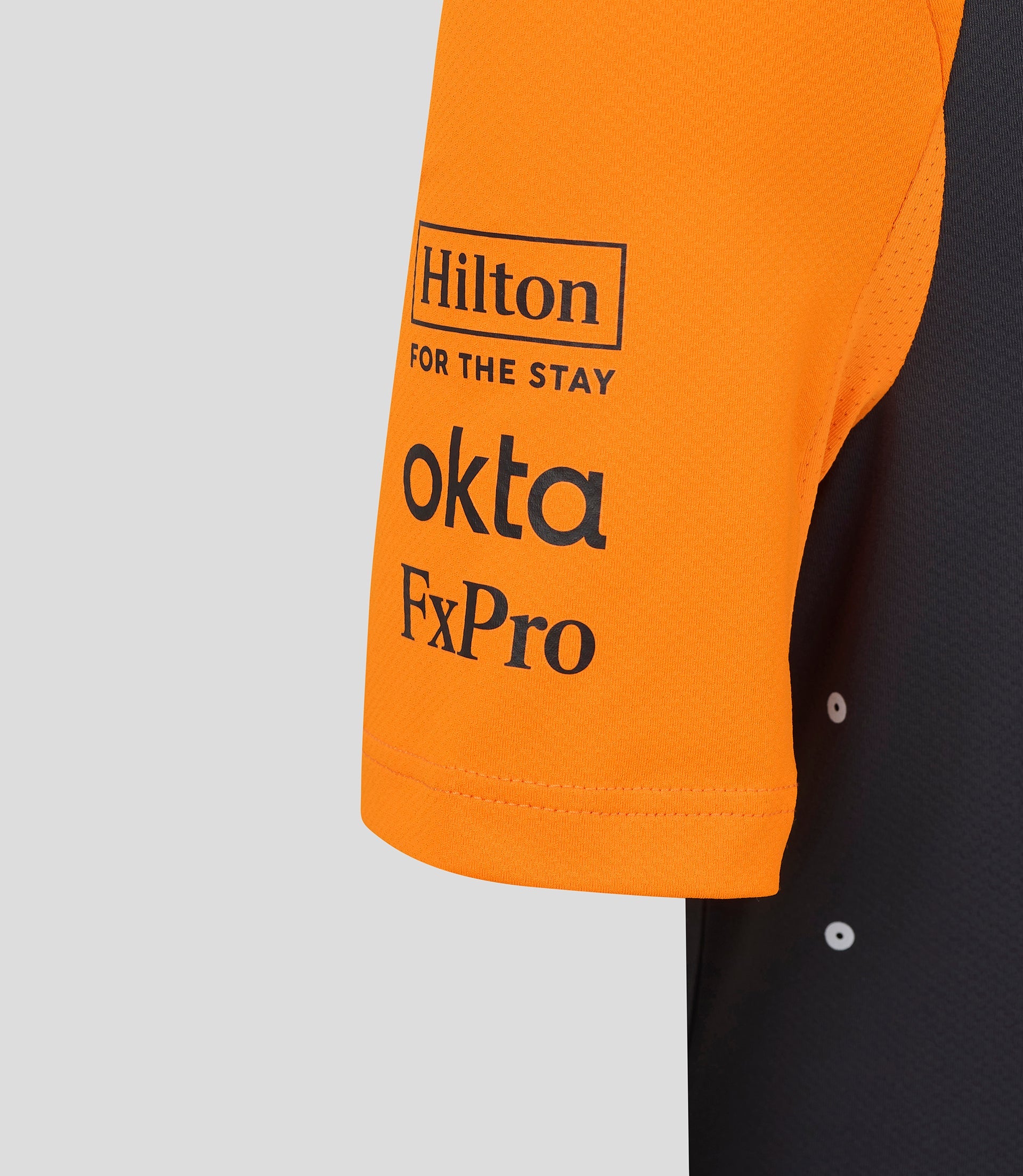 • Team and sponsor logos at chest, shoulders, sleeves, and back
