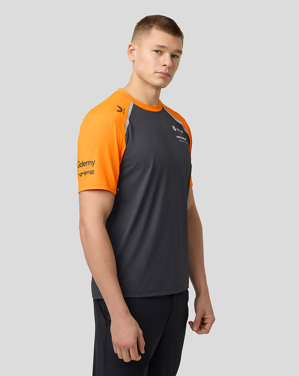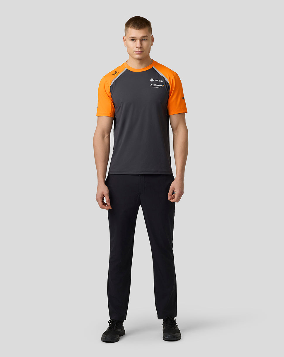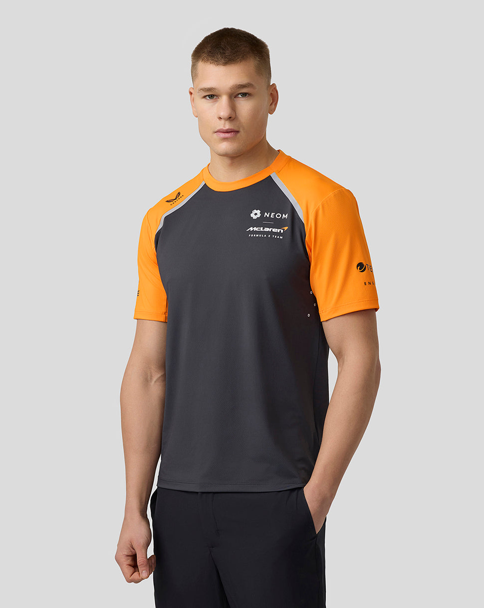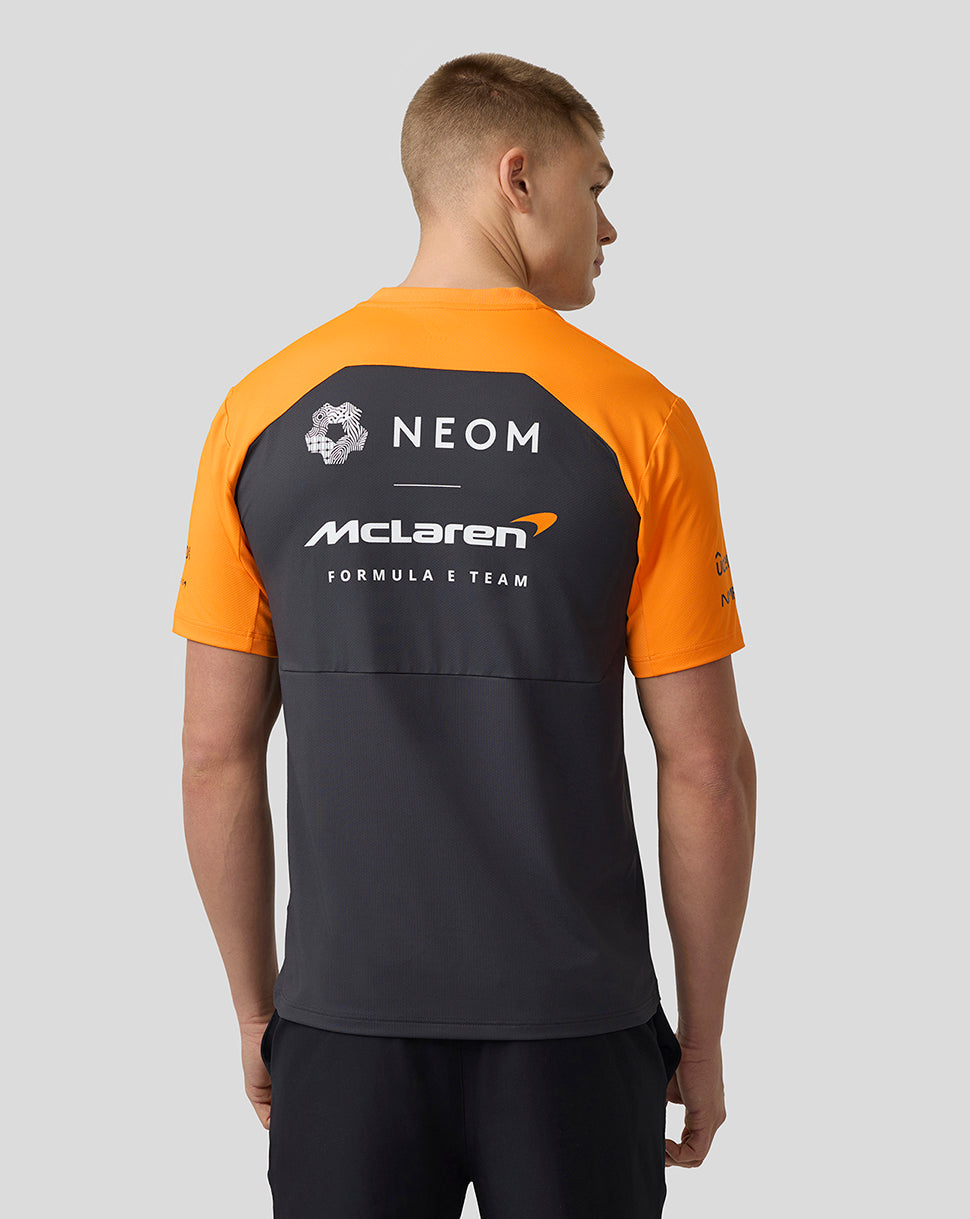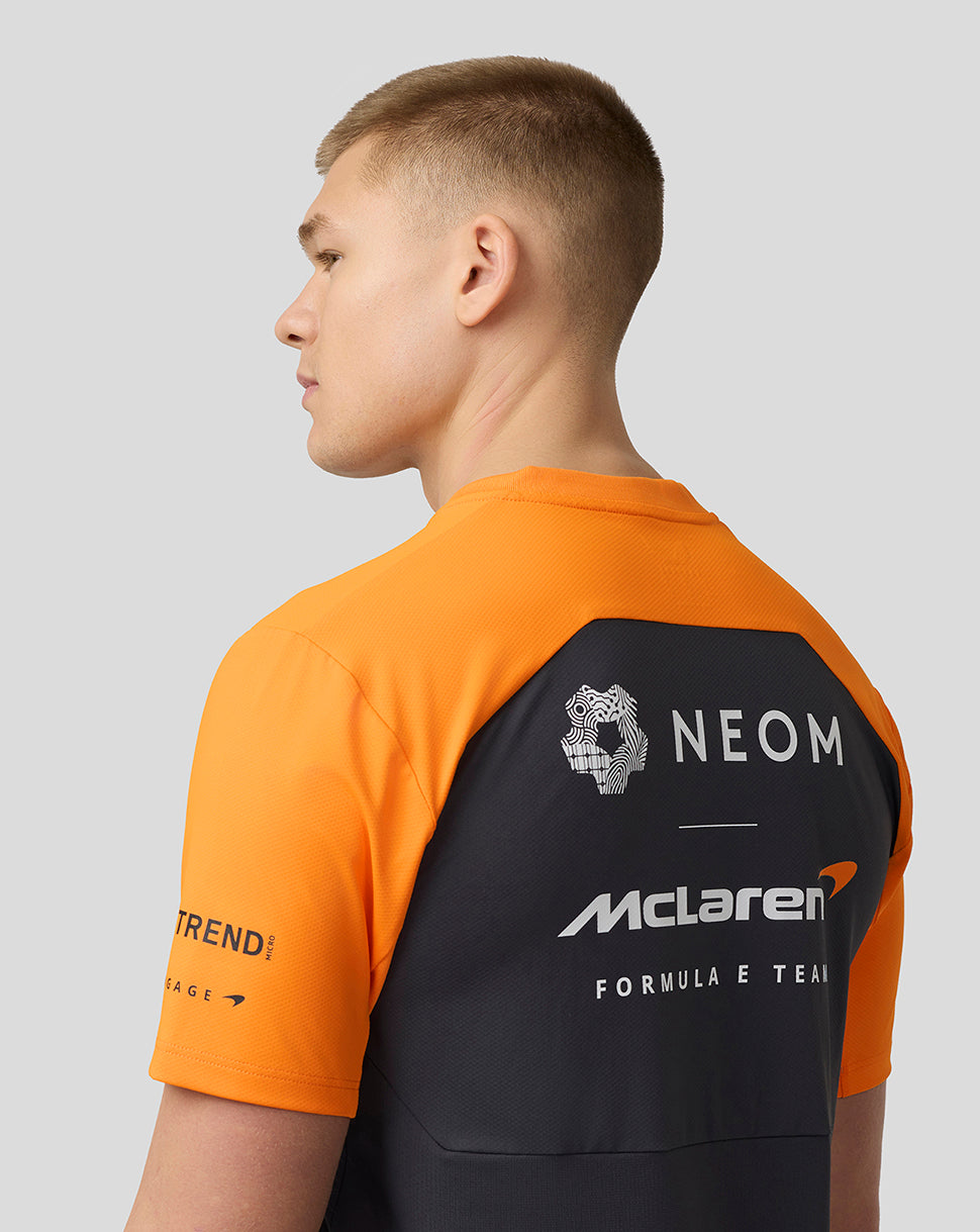 Channel the mentality of the pros in the Official Men’s NEOM McLaren Formula E Team Set-Up T-Shirt. Crafted to guarantee unrestricted movement, this classic team jersey includes a large mesh panel at its rear for increased airflow. A ribbed neckline helps the T-Shirt retain shape, while laser-cut holes promote enhanced ventilation. This design element allows E-Prix fans to soak up the grid’s electrifying atmosphere while maintaining composure during heated moments.