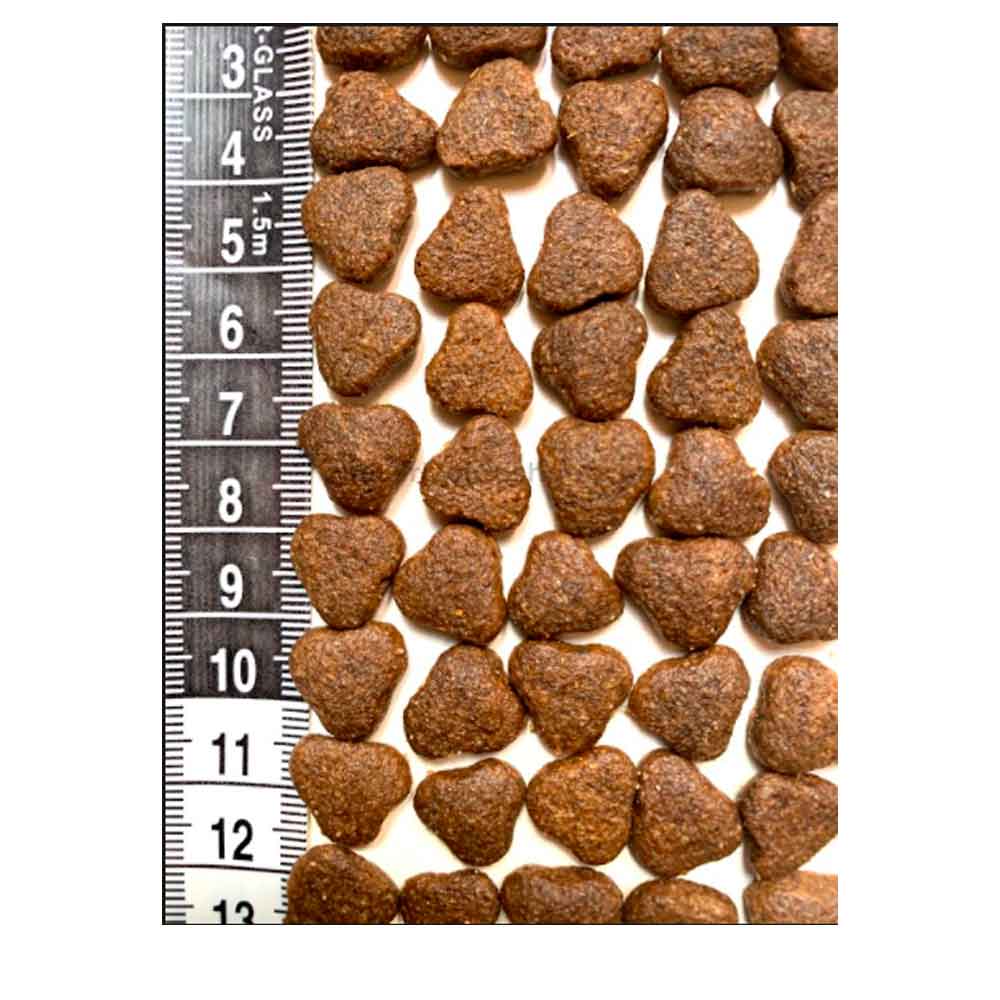 Tonno disidratato (20%), riso integrale (18%), piselli, riso macinato, pesce bianco fresco (10%), olio di pollo, lievito di birra (MOS), proteine del riso, lenticchie (2%), salmone idrolizzato, semi di lino, carruba, sansa di mela (6000 mg/kg), minerali, olio di salmone, carota (1000 mg/kg), pera (500 mg/kg), cicoria (FOS) (500 mg/kg), yucca schidigera, glucosamina e condroitina.