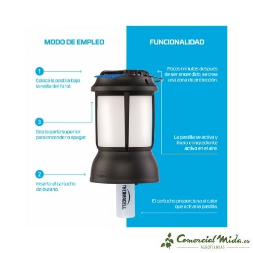 Il Lanterna Thermacell si accende e respinge le zanzare su patii, ponti, eventi all’aperto, campeggio, giardinaggio e altre attività all’aperto. Funziona bruciando una cartuccia di butano che rilascia calore e attiva una pastiglia insetticida che tiene lontane le zanzare in un’area di 20m2.
